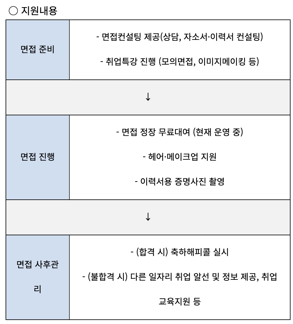해당 프로그램은 면접 정장 대여, 면접 컨설팅 제공(상담, 자소서 이력서 컨설팅 등), 취업특강 및 현직자 직무특강 진행, 이력서 사진촬영, 헤어. 메이크업 지원까지 올케어를 제공해 주는 이천치의 청년 일자리 지원 프로그램입니다!